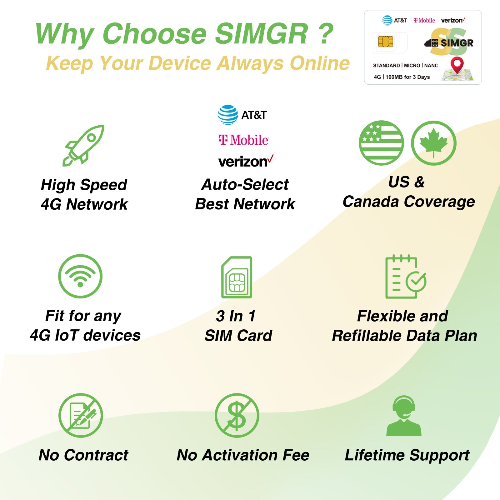 SIMGR GPS Prepaid SIM Card USA Triple-Play Network 4G LTE--Free 100MB |For Camera