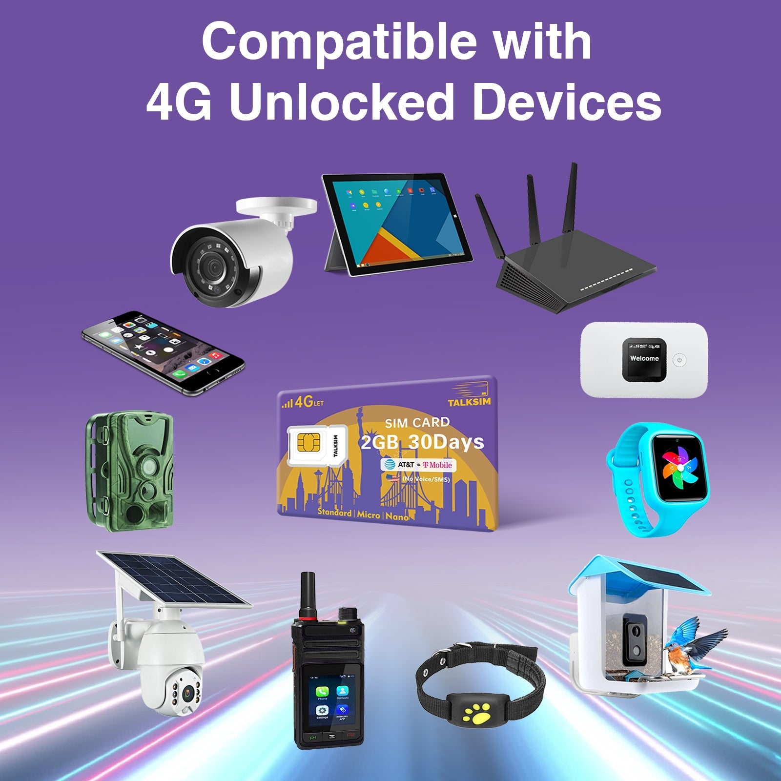 - 【Wide Compatibility】Our SIM card is pre-cut in 3 sizes to fit any device. This Nano SIM card is suitable for various 4G unlocked IoT devices, such as security camera, router modem, mobile hotspot pocket WiFi, smart watch, cell phone, tablet, game/solar trail hunting camera, 4G PoC walkie talkie, Android radio, and car/pet GPS tracker locators devices.