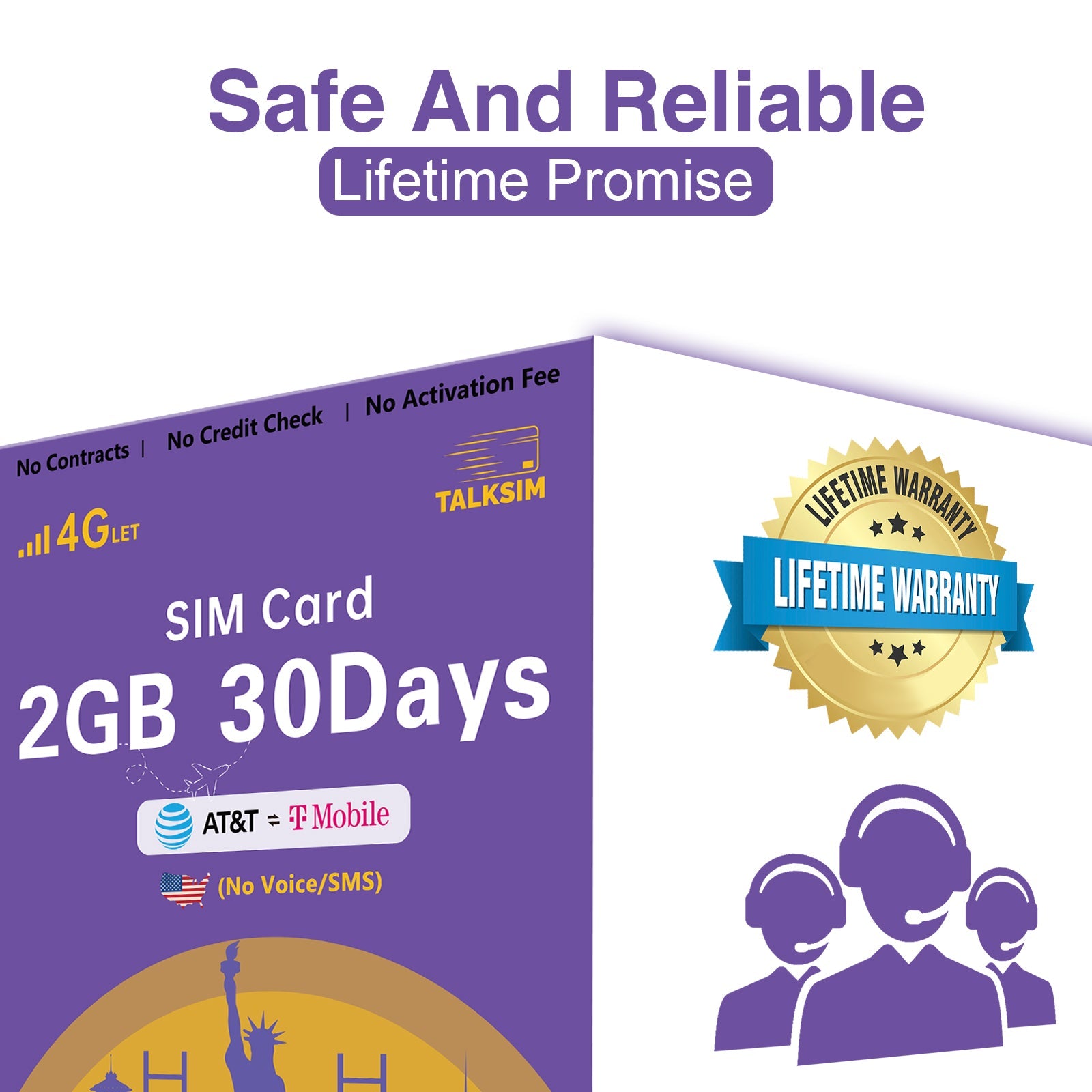 - 【Great 4G Nationwide Coverage】This TALKSIM SIM card provides 2GB of wireless service for 30 days with excellent 4G coverage across the nation. It connects to the high speed 4G LTE network of top American cellular carriers AT&T and T-Mobile. This Data only SIM card automatically selects the best carrier for a strong signal, ensuring reliable access to the nationwide data network wherever you go. By using this USA SIM card, you can experience seamless connectivity throughout the USA.