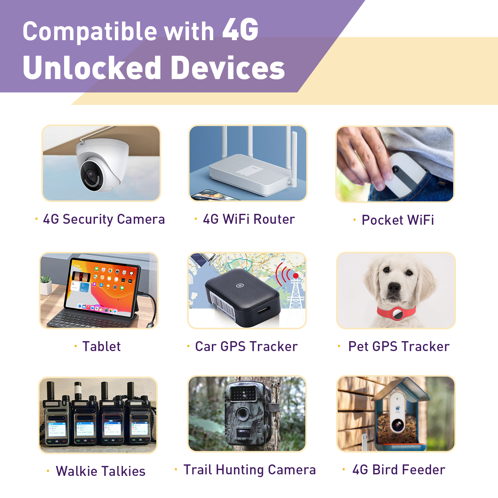 - 【Wide Compatibility】Our IoT SIM card comes in three sizes to fit a variety of devices. This Standard/Micro/Nano SIM card is perfect for a range of 4G unlocked IoT devices such as security cameras, router modems, mobile hotspots, smartwatches, cell phones, tablets, game/trail hunting cameras, 4G PoC walkie talkies, Android radios, and car/pet GPS tracker devices.