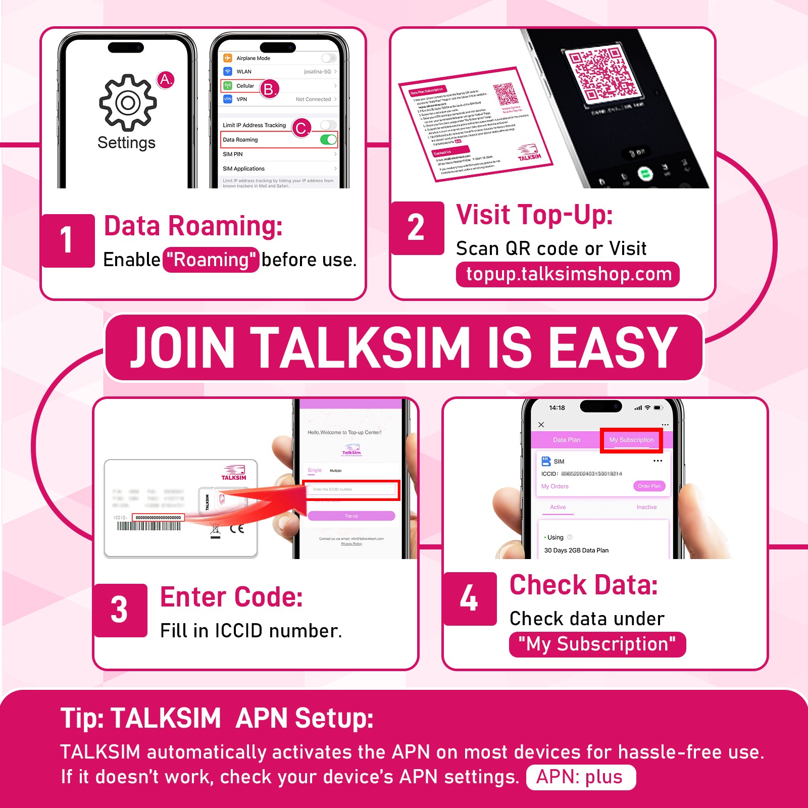 - APN name: TALKSIM /SmartSIM KiwiSIM
